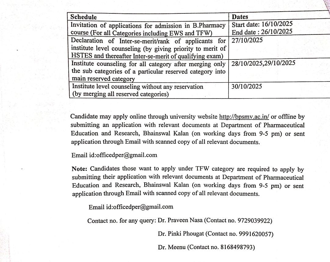 DPER has adopted the Rules & Syllabus for Bachelor of Pharmacy (B. Pharm.) prescribed by PCI, New Delhi.